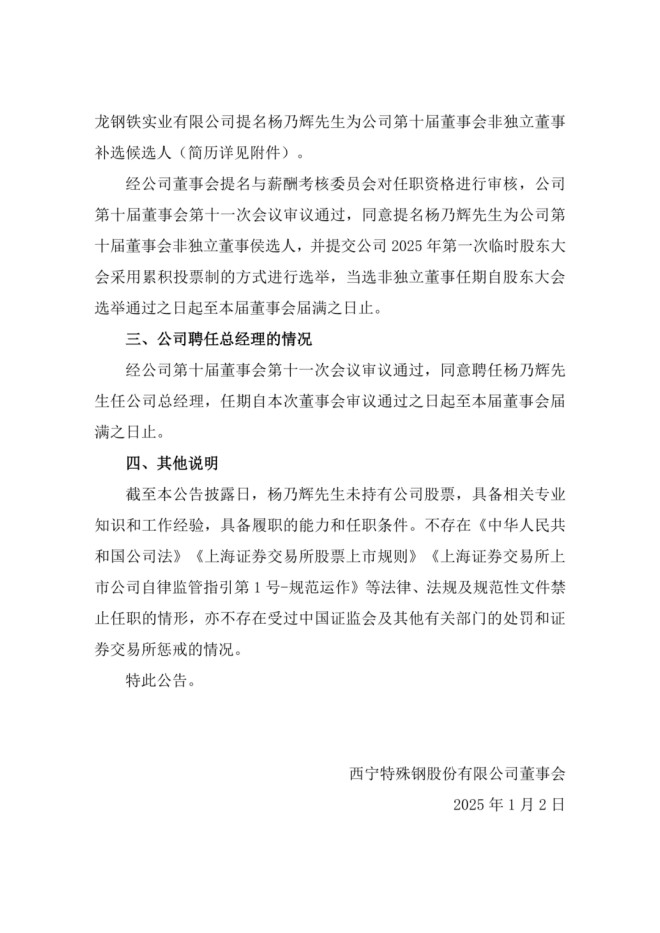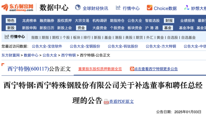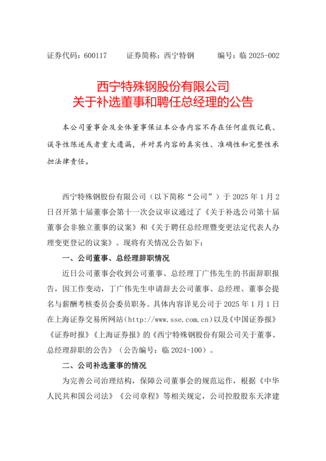 1月3日,西寧特鋼發(fā)布《關于補選董事和聘任總經(jīng)理的公告》(以下簡稱《公告》)。