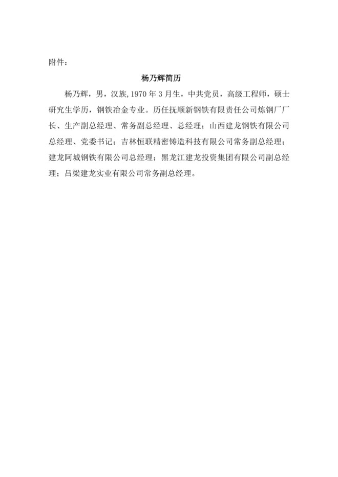 楊乃輝,男,漢族,1970年3月生,中共黨員,高級工程師,碩士 研究生學歷,鋼鐵冶金專業(yè)。歷任撫順新鋼鐵有限責任公司煉鋼廠廠長、生產(chǎn)副總經(jīng)理、常務副總經(jīng)理、總經(jīng)理;山西建龍鋼鐵有限公司總經(jīng)理、黨委書記;吉林恒聯(lián)精密鑄造科技有限公司常務副總經(jīng)理;建龍阿城鋼鐵有限公司總經(jīng)理;黑龍江建龍投資集團有限公司副總經(jīng)理;呂梁建龍實業(yè)有限公司常務副總經(jīng)理。