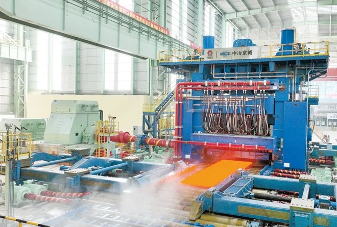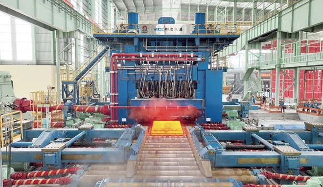 2024年10月31日,由中冶京誠工程技術有限公司(以下簡稱中冶京誠)自主設計供貨的全球最寬厚板軋機——周口鋼鐵5600毫米寬厚板粗軋機熱負荷試車,軋制出第一塊寬厚板,這是全球鋼鐵極限制造領域的又一次成功跨越,標志著世界寬厚板軋機邁入5600毫米新時代。