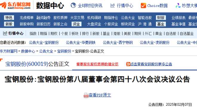 2月7日,寶鋼股份發(fā)布了《寶鋼股份第八屆董事會第四十八次會議決議公告》。
