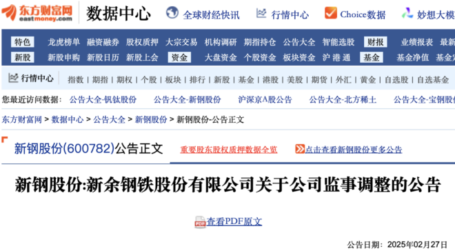 2月27日,新鋼股份發布《關于公司監事調整的公告》。