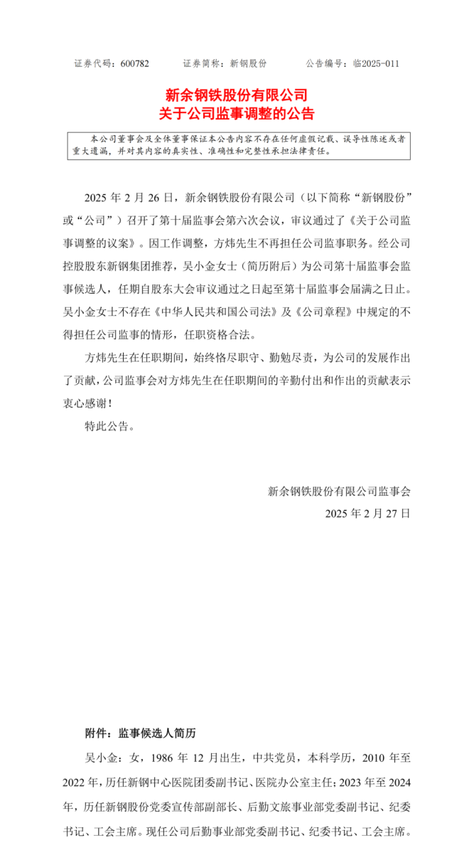 其中顯示,2025 年 2 月 26 日,新余鋼鐵股份有限公司(以下簡稱“公司”)召開了第十屆監事會第六次會議,審議通過了《關于公司監事調整的議案》。因工作調整,方煒先生不再擔任公司監事職務。經公司控股股東新鋼集團推薦,吳小金女士為公司第十屆監事會監事候選人,任期自股東大會審議通過之日起至第十屆監事會屆滿之日止。