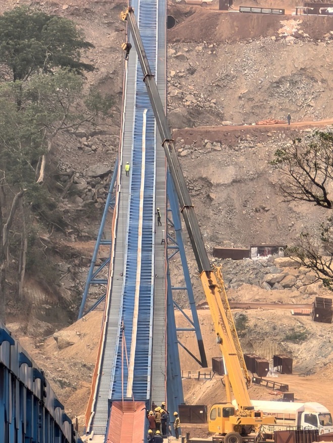 西芒杜礦山礦石下山運輸膠帶系統是項目的核心樞紐工程。礦山公司本次率先啟動膠帶安裝的CV2段全長1980米,穿梭于陡峭的山林之間,土建與安裝難度極高。自2024年3月17日開始土建基礎施工,經過358天的不懈努力,2025年3月10日第一片250米長的膠帶鋪到了托輥上,標志著這一關鍵工程進入到了最后的沖刺階段。