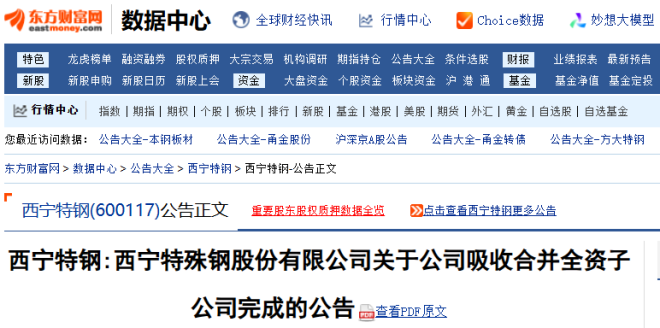 4月3日,西寧特鋼發布了《西寧特殊鋼股份有限公司關于公司吸收合并全資子公司完成的公告》(以下簡稱《公告》)。