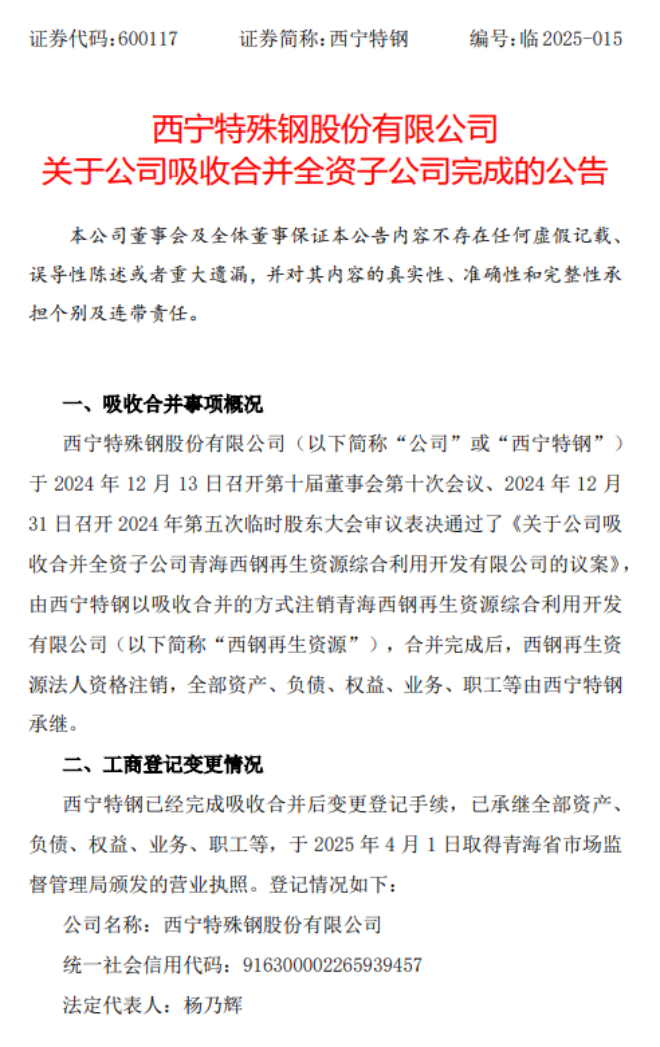 西寧特鋼已經完成吸收合并后變更登記手續,已承繼全部資產、負債、權益、業務、職工等,于2025年4月1日取得青海省市場監督管理局頒發的營業執照。