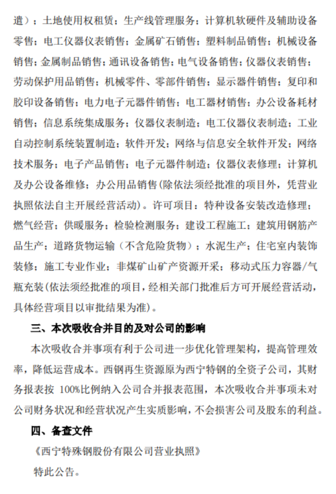 從《公告》中獲悉,西寧特殊鋼股份有限公司于2024年12月13日召開第十屆董事會第十次會議、2024年12月31日召開2024年第五次臨時股東大會審議表決通過了《關于公司吸收合并全資子公司青海西鋼再生資源綜合利用開發有限公司的議案》,由西寧特鋼以吸收合并的方式注銷青海西鋼再生資源綜合利用開發有限公司,合并完成后,西鋼再生資源法人資格注銷,全部資產、負債、權益、業務、職工等由西寧特鋼承繼。