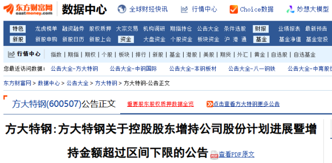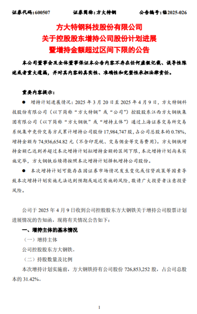 4月10日,方大特鋼發布了《方大特鋼科技股份有限公司關于控股股東增持公司股份計劃進展暨增持金額超過區間下限的公告》(以下簡稱《公告》)。
