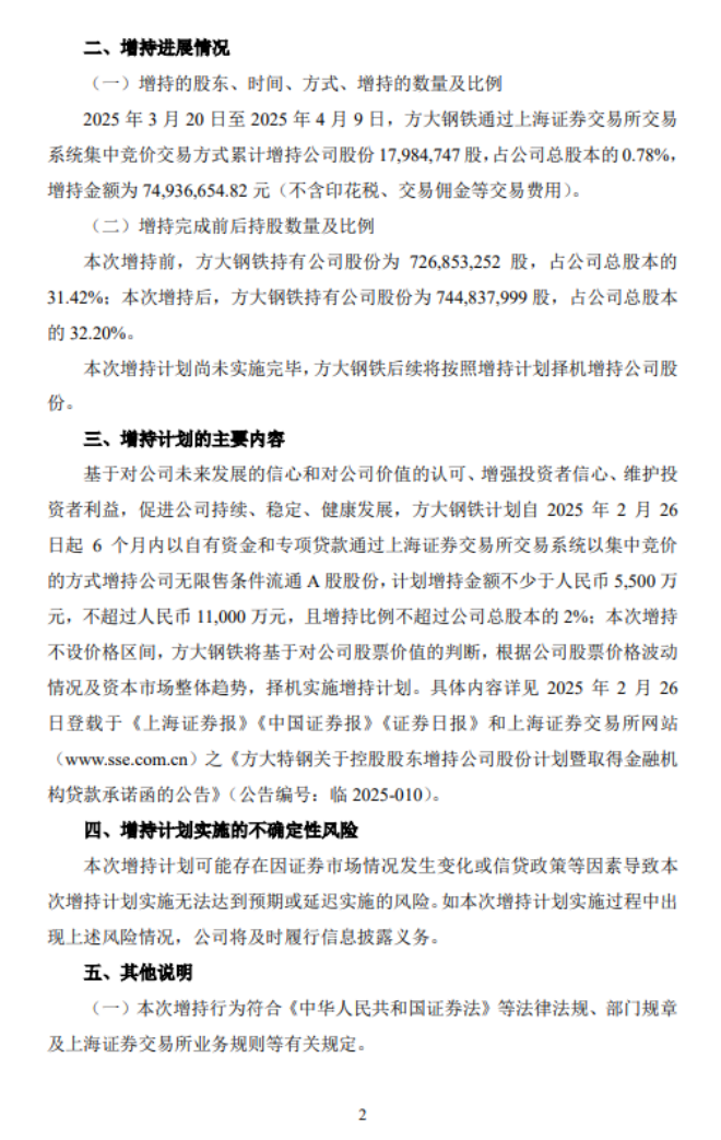 從《公告》中獲悉,控股股東方大鋼鐵于2025年3月20日至2025年4月9日,通過集中競價交易方式增持公司股份1798萬股,占公司總股本的0.78%,增持金額為7494萬元,增持金額已達到并超過本次增持計劃擬增持金額的區間下限,增持計劃尚未實施完畢。