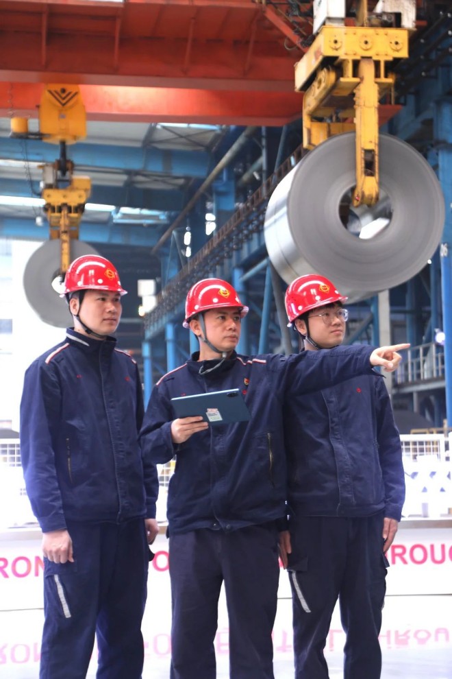 ▲朱旋(中間)與團(tuán)隊(duì)在生產(chǎn)現(xiàn)場(chǎng)調(diào)試AI數(shù)智鋼卷平臺(tái)