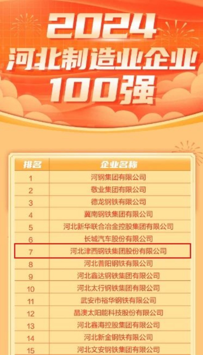 近日,河北省企業聯合會發布了2024河北企業100強、制造業企業100強、服務業企業100強和創新領先50強名單。津西集團子公司津西股份、津西國貿分別上榜2024河北企業100強、制造業企業100強和服務業企業100強。