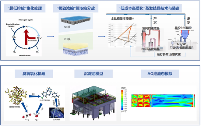 面對水質難題以及行業痛點,中冶南方項目團隊經長期調研分析,依托公司深厚的技術積淀,確定了鋼鐵行業首創的零排放工藝路線:基于 “超低排放” 生化處理+“極致濃縮” 膜濃縮分鹽+“低成本高質化” 蒸發結晶,并應用了高效生物脫氮及耦合除硬技術、高密度智能除硬技術、O3-WISBAF 智效耦合調控系統等多項專有技術,實現穩定運行、水質達標、節能降耗三大目標。