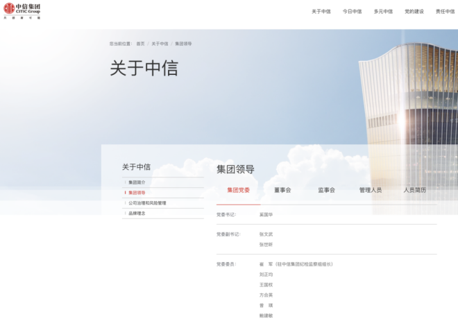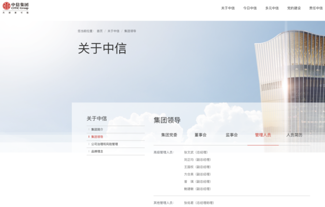 據(jù)中信集團(tuán)官網(wǎng)顯示,鮑建敏已任中國中信集團(tuán)有限公司副總經(jīng)理、黨委委員。