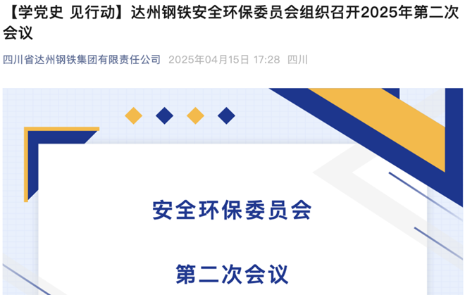 近日,達州鋼鐵官方微信公眾號發布文章《【學黨史 見行動】達州鋼鐵安全環保委員會組織召開2025年第二次會議》。