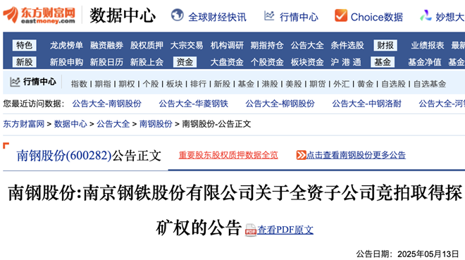 5月13日,南鋼股份發(fā)布公告稱(chēng),5月12日,該公司全資子公司安徽金安礦業(yè)有限公司(以下簡(jiǎn)稱(chēng)“金安礦業(yè)”)以92,036.77萬(wàn)元人民幣競(jìng)得安徽省霍邱縣范橋鐵礦勘探(探礦權(quán)保留)探礦權(quán);同日,金安礦業(yè)與安徽省產(chǎn)權(quán)交易中心有限責(zé)任公司簽訂《競(jìng)價(jià)結(jié)果通知單》。