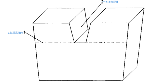 目前撇渣器大多采用預制模塊化設計,采用ASC材料體系已成共識,但是撇渣器的結構化設計仍有許多改進之處。預制撇渣器過梁在使用過程中特別容易發生中間縱向開裂進而發生漏渣過渣問題。發生開裂的原因主要是過梁的下部浸泡在溫度高達1450℃左右高溫鐵水中,耐火材料發生較大的熱膨脹,而上部有約1/3~1/5高度則裸在空氣中處于較低溫度,上表面溫度一般只有300℃左右,其線性膨脹量顯然遠小于過梁的下部。因此開裂一般從上部開始,一般在除鐵后2~3爐即已經出現,并逐步擴大向下延伸如下圖所示: