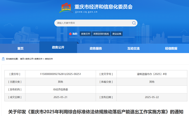 近日,重慶市經(jīng)濟和信息化委員會網(wǎng)站發(fā)布了關(guān)于印發(fā)《重慶市2025年利用綜合標準依法依規(guī)推動落后產(chǎn)能退出工作實施方案》的通知。
