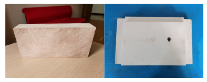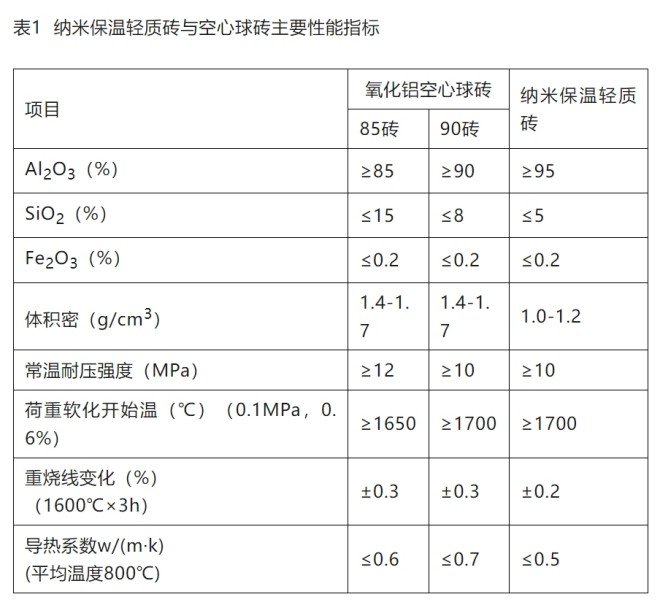 針對以上情況,北京聯合榮大工程材料股份有限公司研發使用納米硅溶膠作為結合劑,采用吸濾成型方法,制備出高強度納米保溫輕質磚(如圖1),可直接用于高溫窯爐的工作部位,降低窯爐的材料用量,提高窯爐的熱效率??扇〈壳捌毡槭褂玫难趸X空心球磚,該材料比氧化鋁空心球磚體密小、強度高,能夠應用于1400~1500℃的高溫環境下,比市場上其他的納米輕質絕熱材料使用溫度高。納米保溫輕質磚與空心球磚主要性能指標見表1。