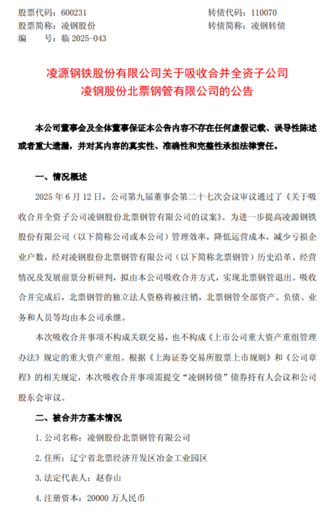 6月13日,凌鋼股份發布了《凌源鋼鐵股份有限公司關于吸收合并全資子公司凌鋼股份北票鋼管有限公司的公告》(以下簡稱《公告》)。