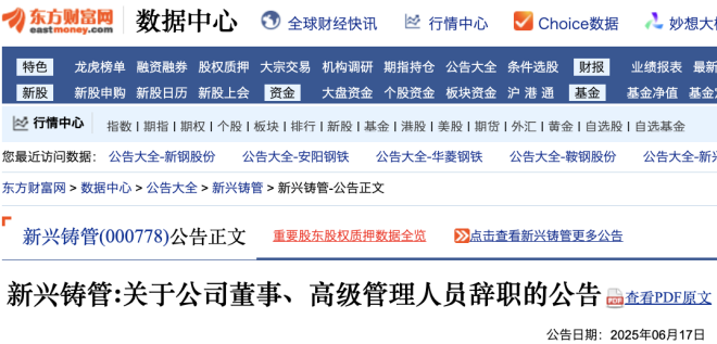 其中顯示,新興鑄管股份有限公司(以下簡(jiǎn)稱“該公司”)董事會(huì)于 2025 年 6 月 13 日收到該公司董事、總經(jīng)理劉濤先生的書面辭職報(bào)告,劉濤先生因工作原因申請(qǐng)辭去該公司董事、戰(zhàn)略委員會(huì)委員、總經(jīng)理職務(wù)。劉濤先生辭職后,不再擔(dān)任該公司任何職務(wù)。