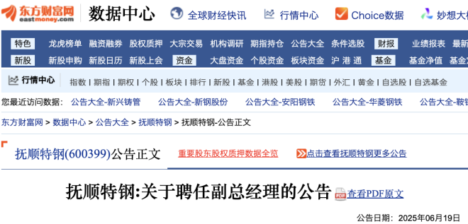 6月19日,撫順特鋼發(fā)布《撫順特殊鋼股份有限公司關(guān)于聘任副總經(jīng)理的公告》。