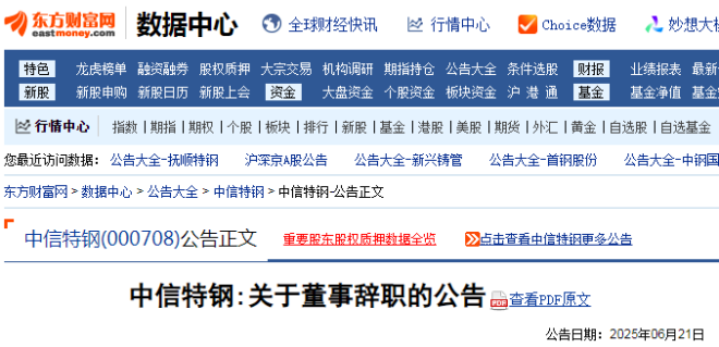 6月21日,中信特鋼發(fā)布了關于董事辭職的公告。