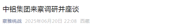 6月20日,察雅統(tǒng)戰(zhàn)公眾號發(fā)布了《中鋁集團來察調研并座談》一文。