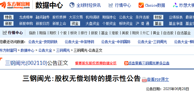 6月28日,三鋼閩光發(fā)布了股權(quán)無償劃轉(zhuǎn)的提示性公告(以下簡稱“公告”)。
