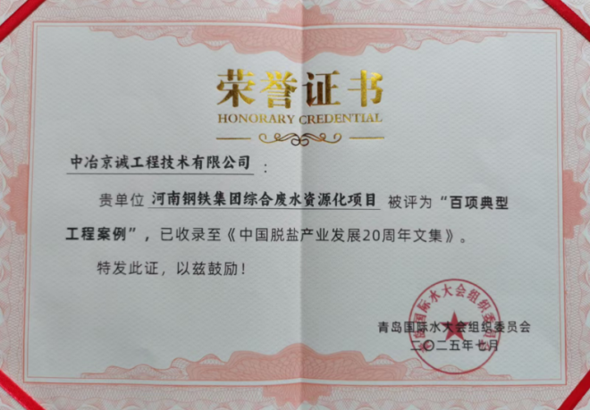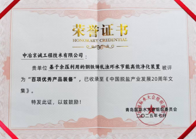 中冶京誠“基于余壓利用的鋼鐵鑄軋濁環水節能高效凈化裝置”與“河南鋼鐵集團綜合廢水資源化項目”分獲中國脫鹽產業20年“百大優秀產品”與“百大典型工程”獎項。兩項成果立足鋼鐵工業水處理需求,通過技術創新實現水資源高效利用和污染物減排,既彰顯了中冶京誠在鋼鐵工業水處理領域的深厚積淀,也為鋼鐵行業綠色轉型提供了可復制的工程范例。