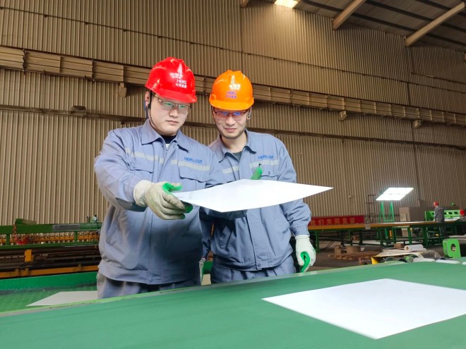 圖為河鋼集團(tuán)大河金屬質(zhì)檢人員正在檢查家電板產(chǎn)線產(chǎn)品質(zhì)量。