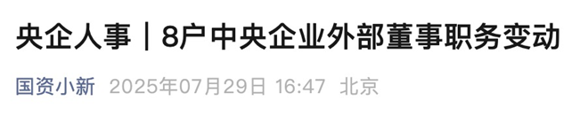 7月29日,國資小新發布《央企人事|8戶中央企業外部董事職務變動》一文。