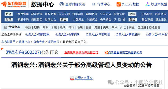 10月18日,酒鋼宏興發布了《酒鋼宏興關于部分高級管理人員變動的公告》(以下簡稱《公告》)。