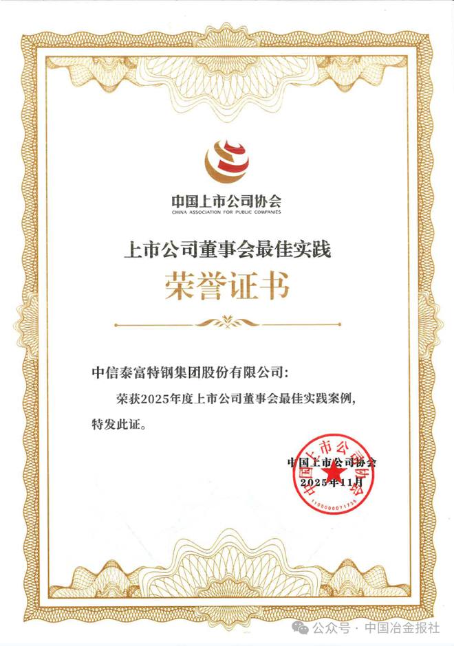 為促進上市公司董事會依法合規運作,提升上市公司治理效能,中國上市公司協會開展了“2025上市公司董事會最佳實踐案例征集活動”。經初審、專家委員會評審、誠信核查等環節,中信泰富特鋼集團(股票簡稱:中信特鋼)董事會榮獲“上市公司董事會最佳實踐”。