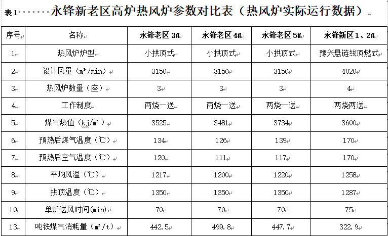 山東永鋒臨港有限公司臨港先進優(yōu)特鋼產(chǎn)業(yè)基地(簡稱永鋒臨港鋼鐵)一期工程1號、2號高爐,各配套使用4座豫興公司優(yōu)化改進的超低節(jié)能懸鏈線頂燃式熱風爐(見表1)。其設計風溫為1250℃,設計拱頂溫度為1350℃,單爐送風60分鐘。兩套熱風爐都在使用單一高爐煤氣,在富氧7%條件下,實現(xiàn)了拱頂溫度1300℃、風溫1250℃穩(wěn)定輸出,5月份全月噸鐵煤氣消耗322.2立方米。其中,在同等煤氣熱值條件下,比永鋒鋼鐵公司其他3座1080立方米高爐小帽子頂燃式熱風爐噸鐵煤氣消耗462.6立方米月平均節(jié)約煤氣140.4立方米,煤氣節(jié)約率為30.3%。