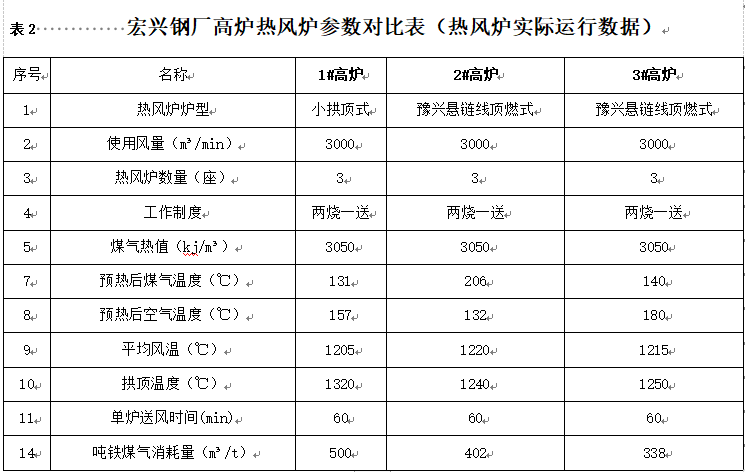 秦皇島宏興鋼鐵有限公司2號、3號高爐分別配套的3座超低節(jié)能優(yōu)化改進型懸鏈線頂燃式熱風爐(見表2),設計風溫為1250℃,設計拱頂溫度為1350℃,單爐送風60分鐘。兩套熱風爐都在使用單一高爐煤氣,煤氣熱值為3000千焦,富氧6%條件下,實現(xiàn)了風溫1215℃~1220℃穩(wěn)定輸出,據(jù)統(tǒng)計5月份全月噸鐵煤氣消耗分別為402立方米、338立方米。在同等煤氣熱值條件下,噸鐵煤氣消耗比1號1080m3高爐引進的頂燃式熱風爐噸鐵平均消耗煤氣500立方米指標分別節(jié)省了98立方米、162立方米,節(jié)省率為19.6%、32.4% 。