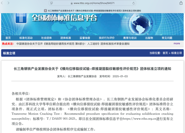 團體標準《橫向位移裂紋試驗-焊接凝固裂紋敏感性評價規范》(Transverse Motion Cracking Test:Recommended procedure specification for evaluating solidification cracking susceptibility)立項通知
