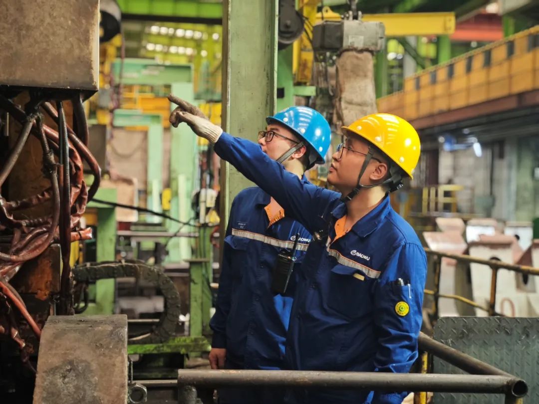 持續推進軋制間隙時間優化攻關,通過新增精軋機架帶鋼中心線自動糾偏功能及高速穿帶功能、優化防追尾程序以及提升熱卷箱投用軋制節奏等措施,5月軋制間隙時間較1-4月平均水平縮短27秒,產量提升至812.69噸/小時,創歷史新高。以勞動競賽為引擎,激發全員活力,掀起比學趕超的熱潮,從“精軋換輥攻堅戰”到“粗軋輥縫精度保衛戰”,技術員扎根現場調參數,班組主動認領挑戰目標,操作工爭分奪秒提節奏……5月精軋換輥平均時間縮短至12.07分鐘,為產線效率提升提供了堅實保障。