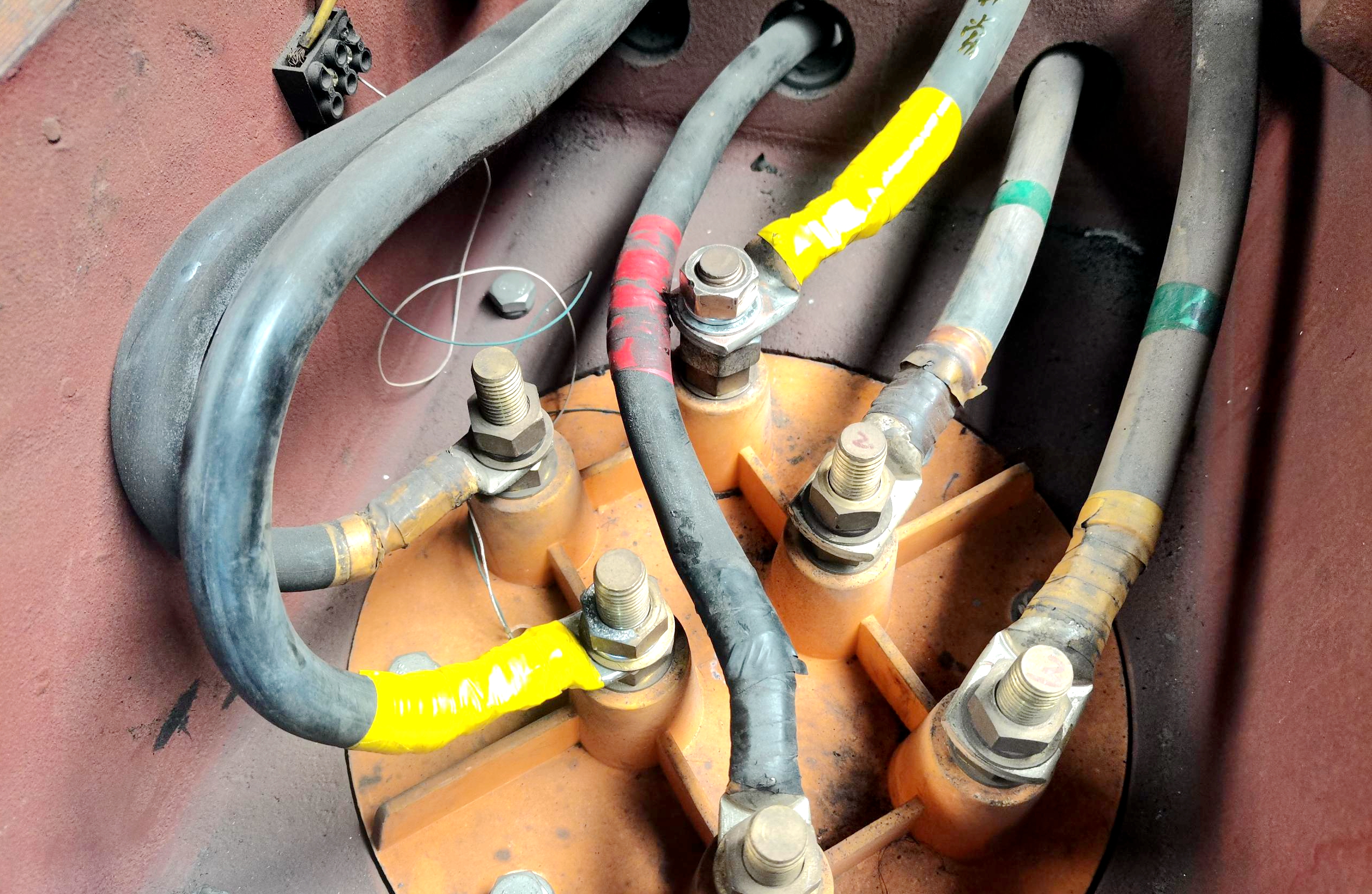 2月23日,維檢員巡檢84號大車時,發現其運行偶發停滯。傳統排查需逐項檢查機械傳動部件,耗時長,用熱成像儀一掃,電機外殼明顯異常發熱,進一步拆解發現,西南電機電纜兩相電源線線耳松動,若不及時緊固,可能引發短路停機。4月29日,18號車主起升2號調壓裝置的排查更驗證了熱成像儀的“預判力”:掃描中,一根電纜溫度高達70℃(正常僅37℃),經確認是線耳壓緊不牢所致。團隊立即切換備用裝置保障生產,待停機時徹底檢修,避免了電纜過熱起火、設備損壞的重大事故。