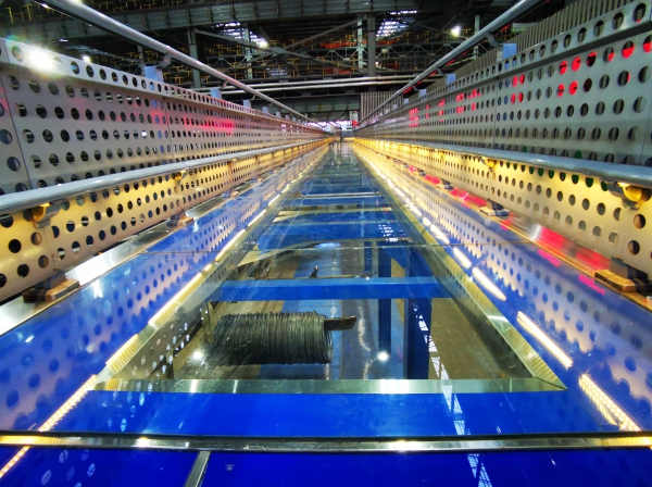 外出旅游,很多人都會選擇到“網(wǎng)紅地”打卡。比如久負盛名的婺源彩虹橋、張家界玻璃棧道等。然而就在不久前,該公司軋鋼廠也特別打造了一條“玻璃棧道”,在高速線材PF鏈區(qū)域,游客可以透過明亮的玻璃,直觀看到腳下運轉(zhuǎn)中的PF鏈,以及掛在C型鉤上已經(jīng)打包好準備入庫的線材成品。這樣全新的沉浸式體驗,讓游客在直觀感受鋼鐵企業(yè)火熱、有序的生產(chǎn)氛圍的同時,更增添了工業(yè)旅游的豐富性與新奇感。