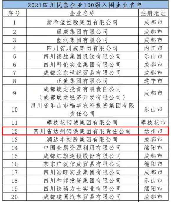 10月9日,2021四川民營企業100強發布會在成都舉行,四川省達州鋼鐵集團有限責任公司以1947436萬元營收總額位列2021四川民營企業100強第12位,較2020年上升4位。