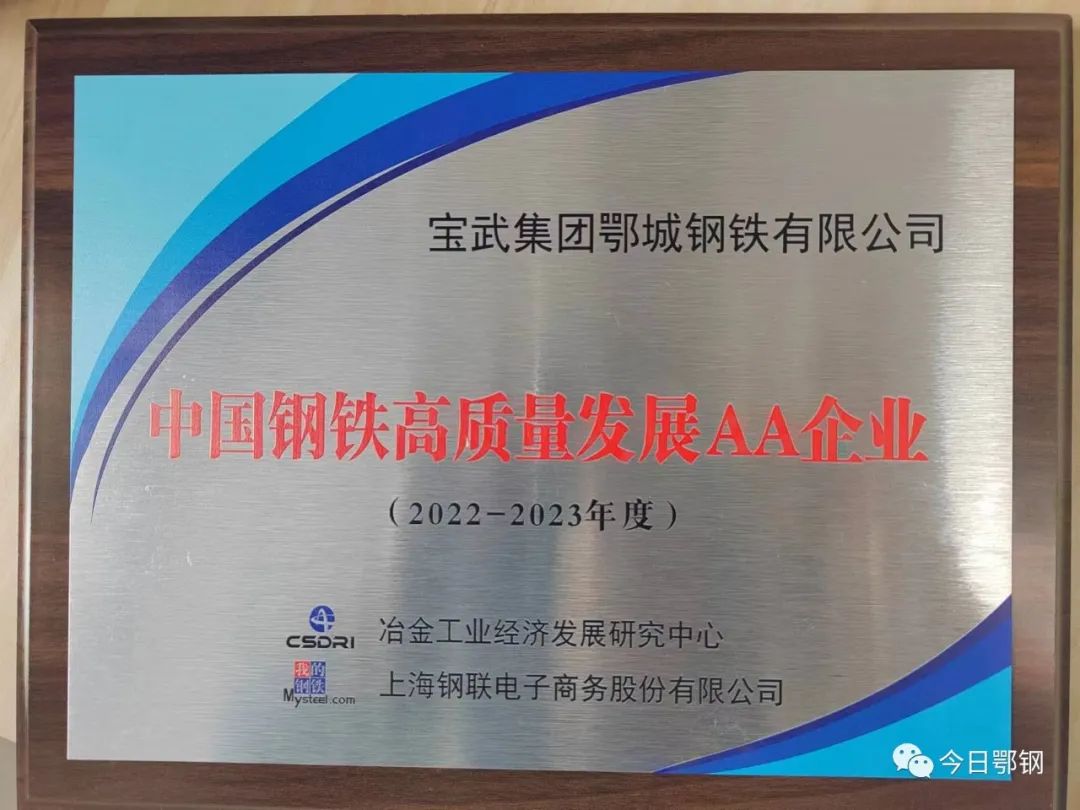 近日,“2022-2023年度中國鋼鐵企業高質量發展指數(EDIS)”榜單揭曉,鄂城鋼鐵榮獲中國鋼鐵企業高質量發展AA企業。