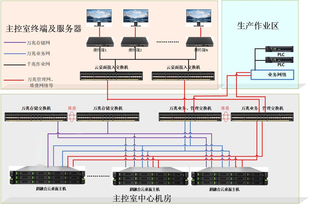 業務及管理交換機通過與基礎自動化交換機進行打通,實現網絡打通,可以接入視頻信號、PCL業務打通等。通過與瘦終端接入交換機打通,實現云桌面的訪問。
