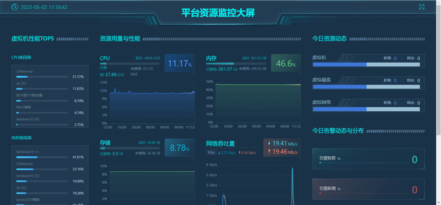 提供大屏監控能力,可在線觀看云平臺整體運行情況及業務情況,為后續擴容、升級提供相應的參考。