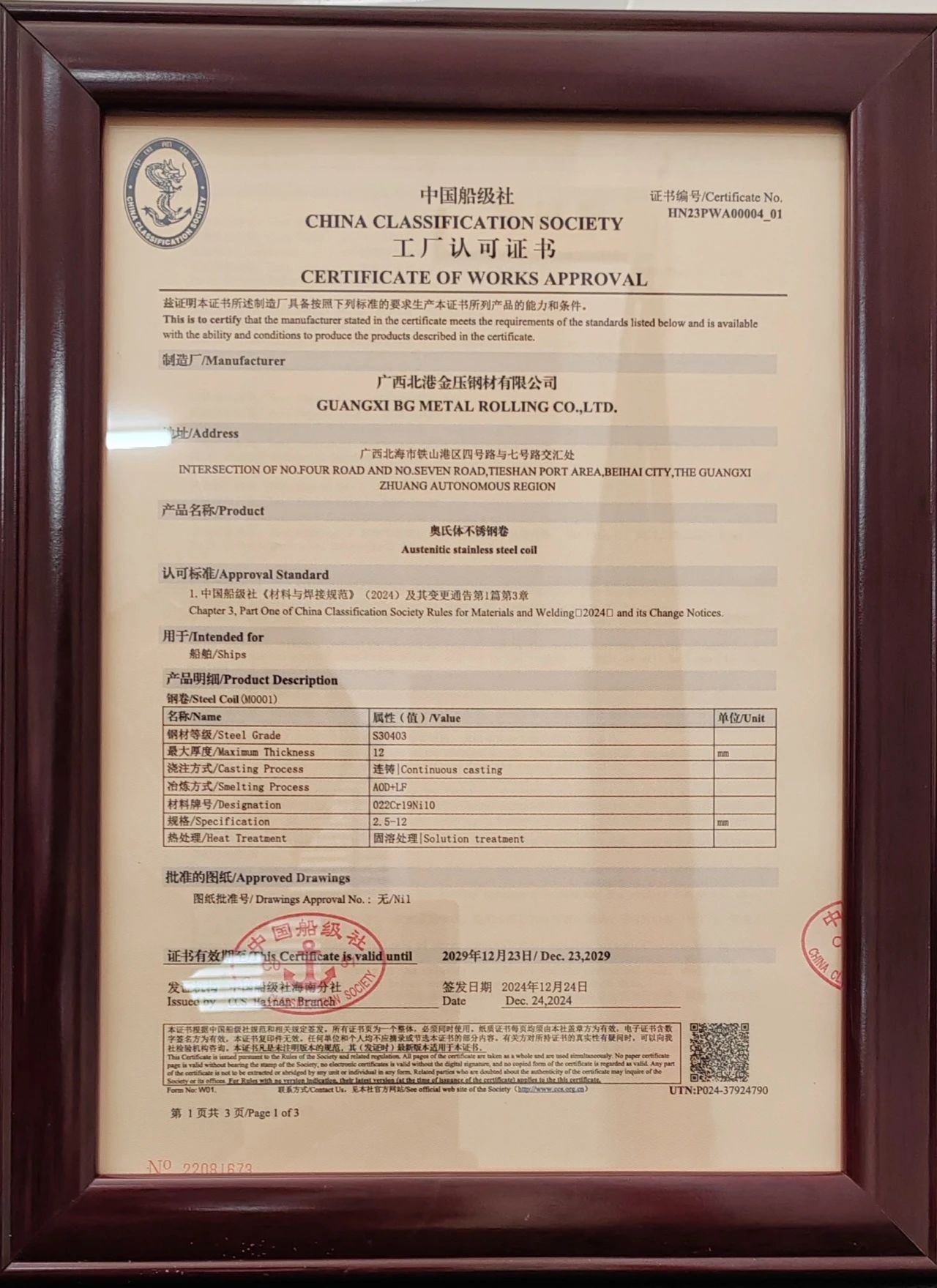 12月24日,中國船級社海南分社向北港金壓鋼材公司頒發(fā)中國船級社(CCS)工廠認(rèn)可證書。此次證書的頒發(fā)標(biāo)志著北港新材料公司旗下北港金壓鋼材公司生產(chǎn)的304不銹鋼產(chǎn)品已經(jīng)達(dá)到船級用鋼應(yīng)用標(biāo)準(zhǔn),為公司在船舶及海洋工程領(lǐng)域的發(fā)展奠定了堅實(shí)基礎(chǔ)。