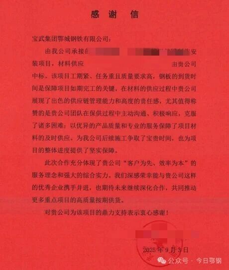誠信是企業的立身之本,擔當是國企的應有之義。錦旗和感謝信不僅是對鄂鋼保供工作的肯定,更是對鄂鋼誠信文化建設成果的認可。如今,鄂鋼已將保供經驗轉化為長效機制,進一步完善了應急保供體系,提升了服務質量水平,為繼續服務國家重點工程項目奠定堅實基礎。(潘苗)