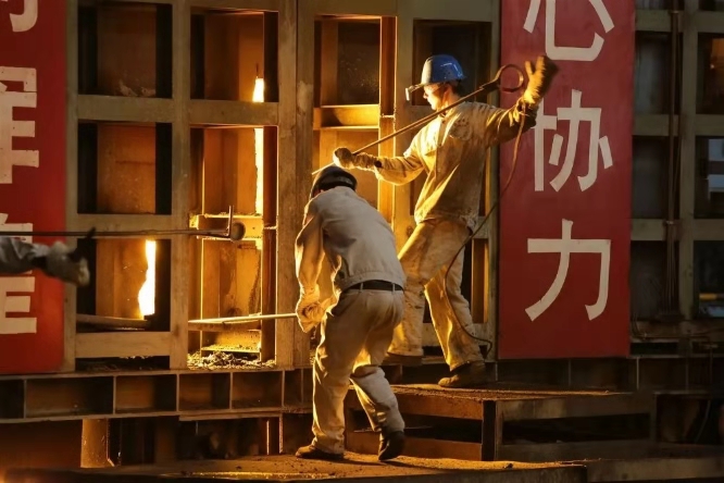 “這里真熱。”這是筆者來到現(xiàn)場的第一感受。雖然清晨8:00外面還是涼風(fēng)陣陣可是走進(jìn)廠房,一股熱浪撲面襲來,沒走幾分鐘,汗水已布滿了額頭。遠(yuǎn)遠(yuǎn)就看見兌鐵平臺(tái)混鐵爐工,在爐門前弓著身子手拿風(fēng)鎬由下向上一點(diǎn)一點(diǎn)地清理爐門框積渣,爐內(nèi)一千多度的高溫,火焰從爐門外竄汗水在安全帽下通紅的臉龐上不停流淌,工作服的后背很快就濕透了,但是為了生產(chǎn)的順行,他克服迎面撲來的爐溫的“烤”驗(yàn),不停地清理渣塊。“這天氣,簡直是在蒸桑拿!”一旁剛剛?cè)⊥觇F水樣的混鐵爐工一邊用搭在脖子上的毛巾擦汗,一邊笑著對(duì)我說:“我們?cè)缍剂?xí)慣這種生活了,現(xiàn)在班中產(chǎn)量緊、任務(wù)重,只要能為下道工序做好服務(wù),辛苦點(diǎn)不算啥。”