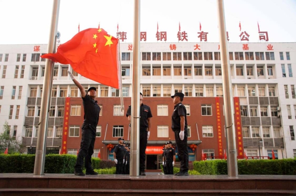 上午8時,在公司辦公大樓前,國旗迎風招展,電子屏幕上宣傳標語格外醒目。該公司領導及各單位(部門)員工代表120余人著裝整齊,精神飽滿地在公司辦公大樓前列隊參加儀式。由企業員工組成的護旗手和國旗護衛隊邁著矯健有力的步伐,莊重地將國旗護送到升旗臺。