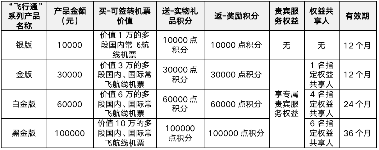 現(xiàn)階段“飛行通”產(chǎn)品包括黑金版、白金版、金版、銀版四檔。旅客購買產(chǎn)品后,即可獲得對應(yīng)價(jià)值的可簽轉(zhuǎn)機(jī)票,還可獲贈等額數(shù)量的實(shí)物禮品積分和等額數(shù)量的獎勵積分,即享“買1送1返1”3重權(quán)益。例如購買售價(jià)10萬元的“飛行通”黑金版產(chǎn)品后,除獲得價(jià)值10萬元的可簽轉(zhuǎn)機(jī)票外,根據(jù)已交付可簽轉(zhuǎn)機(jī)票的使用進(jìn)度,旅客還將陸續(xù)獲贈可在“飛行通”產(chǎn)品專區(qū)內(nèi)使用的10萬點(diǎn)獎勵積分,以及可在“飛行通”產(chǎn)品專區(qū)禮品兌換站使用的10萬點(diǎn)實(shí)物禮品積分。獎勵積分可用于兌換等額標(biāo)價(jià)的機(jī)票或其他附加航空服務(wù)產(chǎn)品,禮品積分可用于在禮品兌換站兌換精選實(shí)物禮品。通過“飛行通”產(chǎn)品訂座或兌換的機(jī)票均可享受便捷退改權(quán)益。