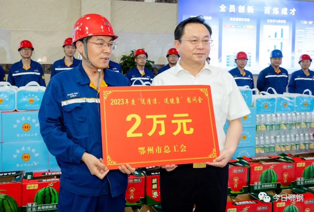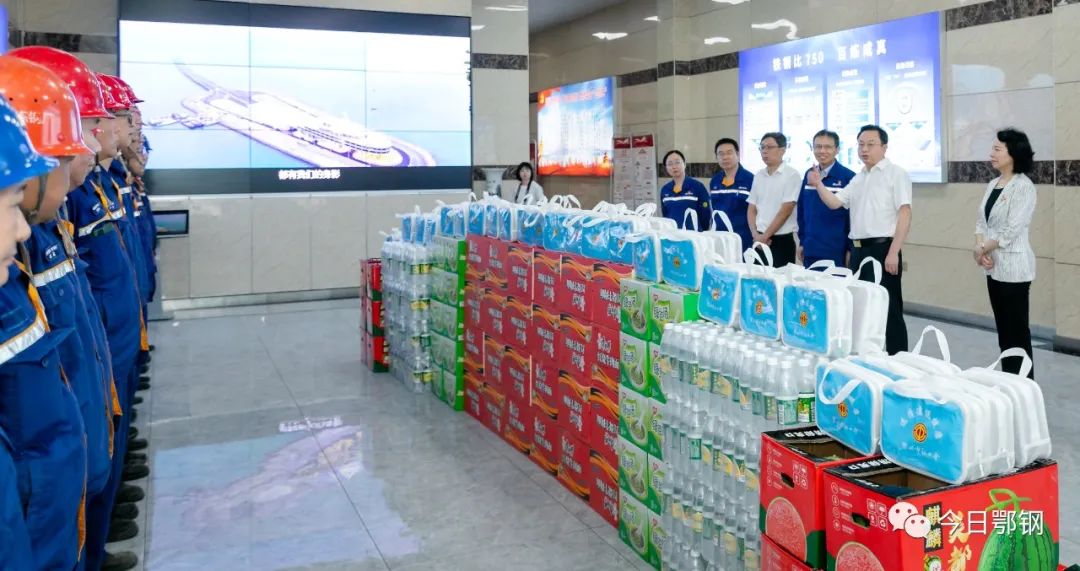 在煉鋼廠,孫兵與一線職工代表們親切握手,將西瓜、鹽汽水、綠豆湯、衛浴洗漱包等防暑降溫慰問用品送到職工手中,將慰問金送到煉鋼廠廠長劉復興手中。