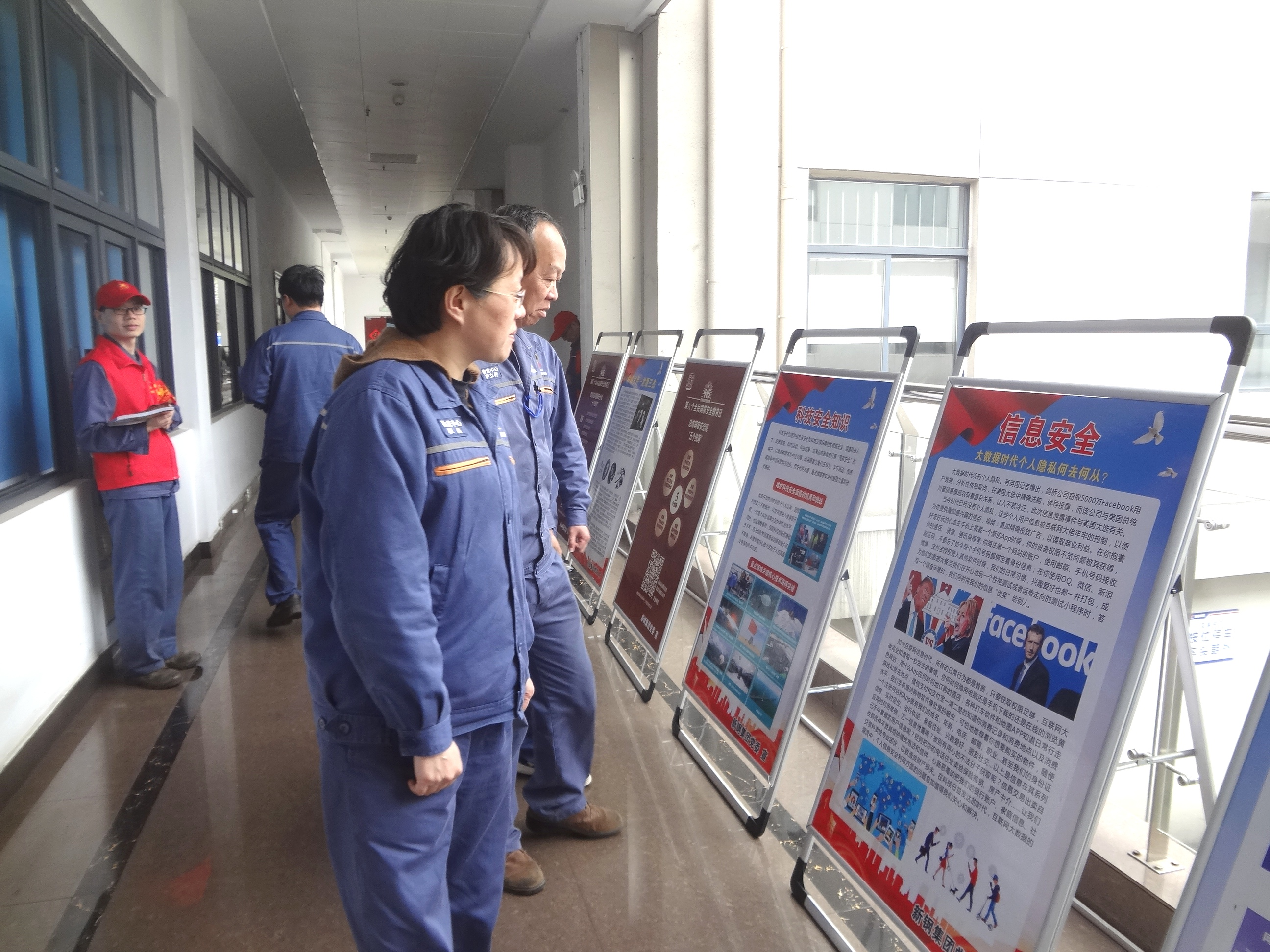 國家安全宣傳展板,吸引了前來就餐的職工駐足觀看。食堂內一塊大型電子顯示屏滾動播放國家安全及保密知識宣傳片,讓職工一邊用餐,一邊觀看專題片,普及國家安全知識。