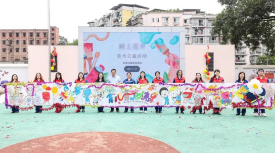 繪畫是孩子們表達想象力、創造力的一種獨特方式。表演結束后,青峰志愿者和學生們一起參與美術公益活動,在提前準備的長卷上繪制主題畫,用水彩、丙烯、超輕黏土、水粉以及各種繪畫材料,為想象插上翅膀,讓創意天馬行空,畫筆跳躍、思緒飛揚,靈巧的雙手描繪出對未來五彩生活的期待。